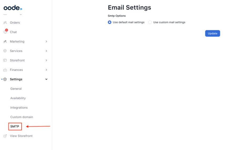 Go to the SMTP Email settings page in your Oode dashboard. You can find SMTP under Settings, or go directly to: https://app.oode.com/dashboard/setting/smtp