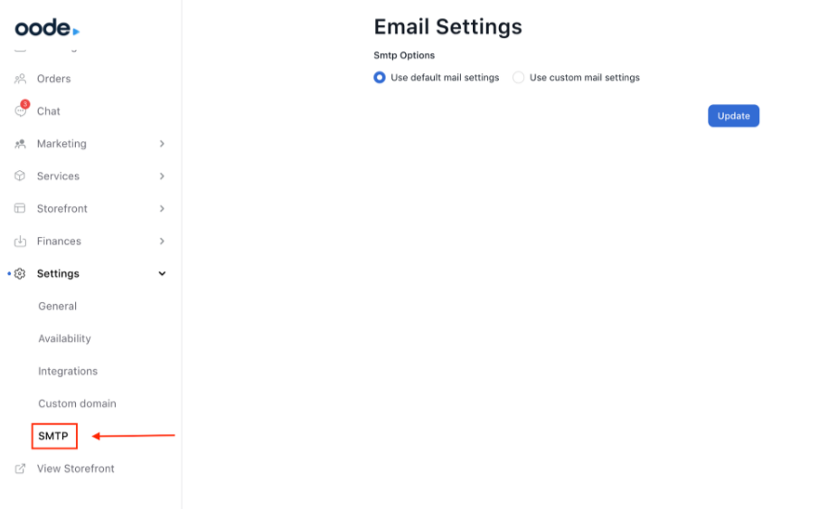 Go to the SMTP Email settings page in your Oode dashboard. You can find SMTP under Settings, or go directly to: https://app.oode.com/dashboard/setting/smtp